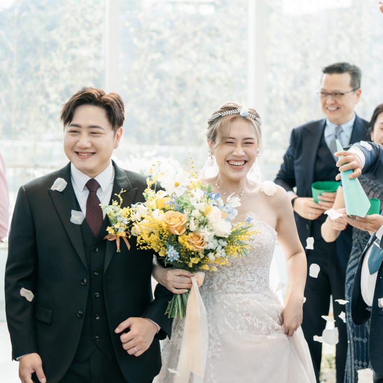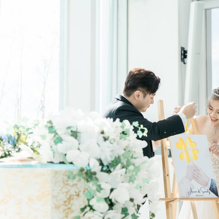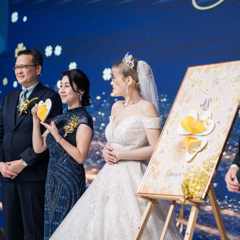 從迎賓的愛心造型葉片、儀式中用幸運草串聯起新人與主婚人間的情感,到席間的幸運抽獎,環環相扣,訴說兩人相遇的幸運與命定。