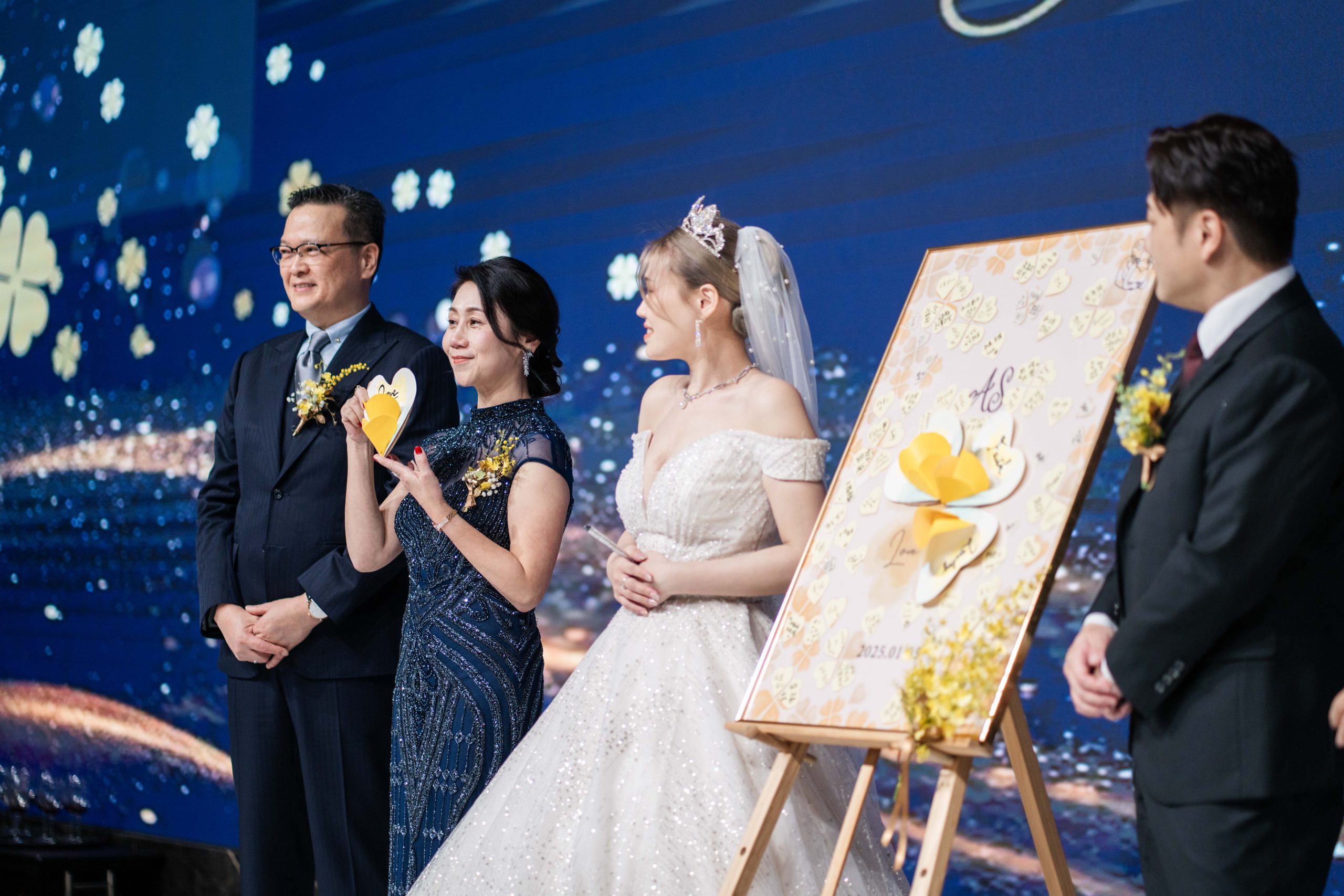 四片幸運葉,象徵父母給予的祝福:幸運、希望、信仰與愛情。爸媽將葉片貼上,組成立體幸運草,兩人親手簽署這份來自家的祝福,承諾攜手共度此生。