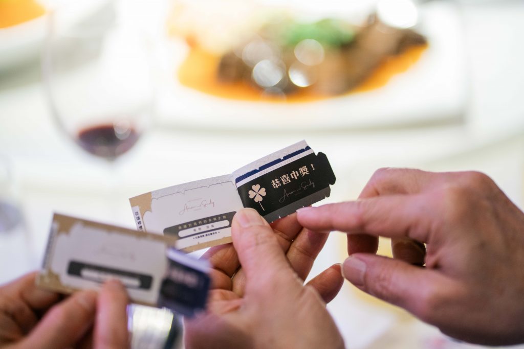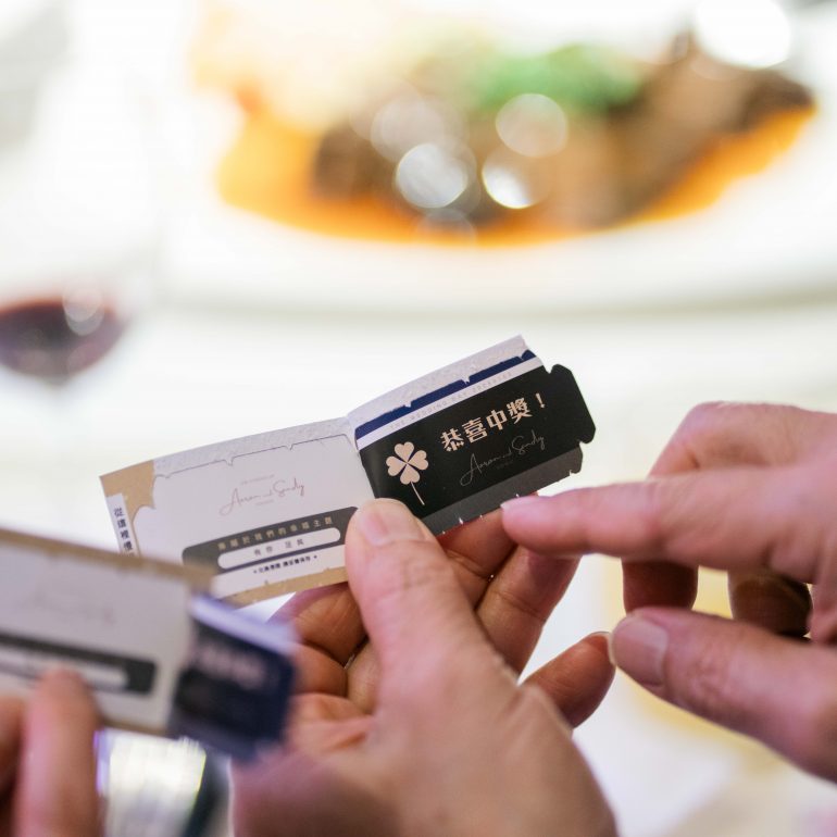 每位賓客位上附上一張刮刮卡,出現「恭喜中獎」者可獲得禮物,代表他是當桌的幸運星,把喜氣與祝福一併帶回家!