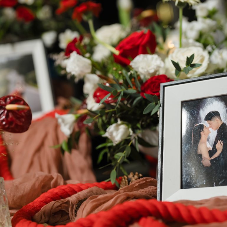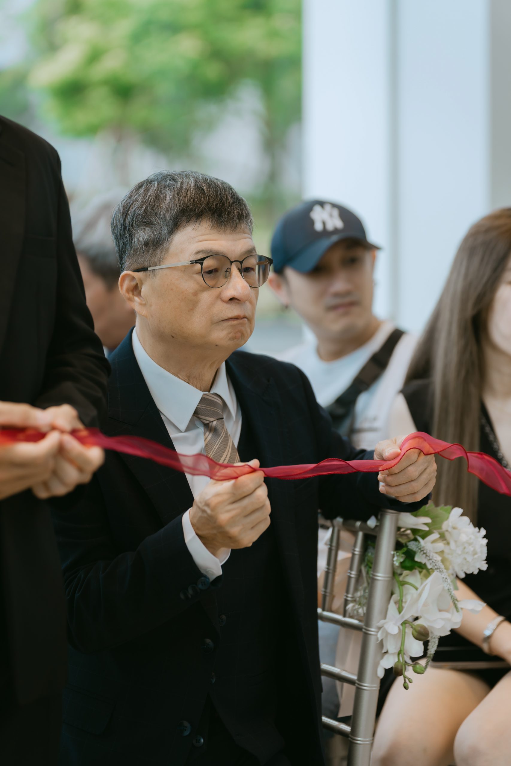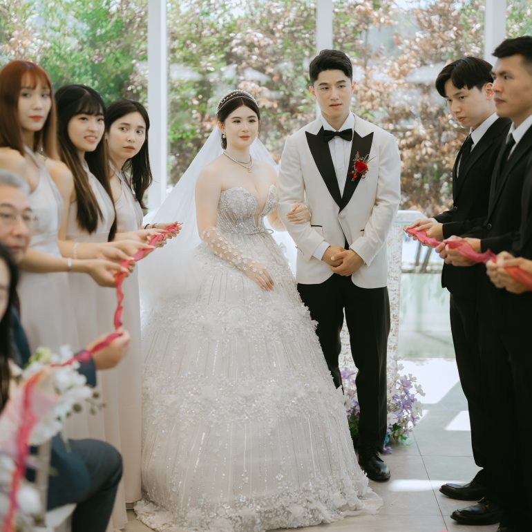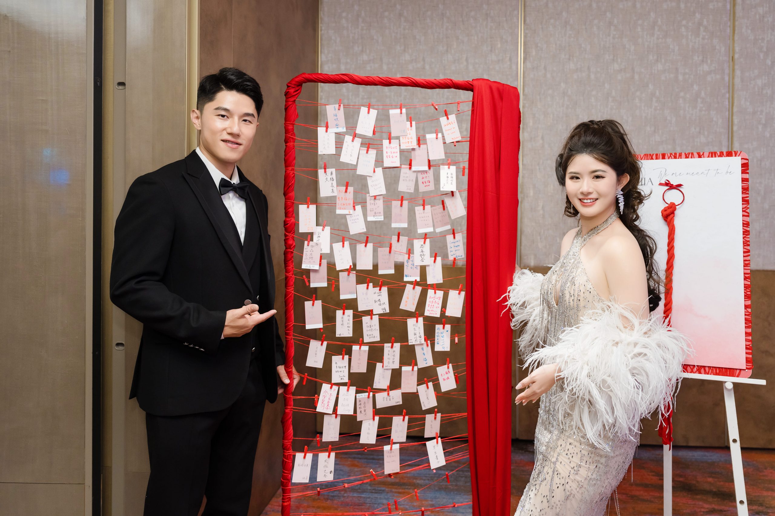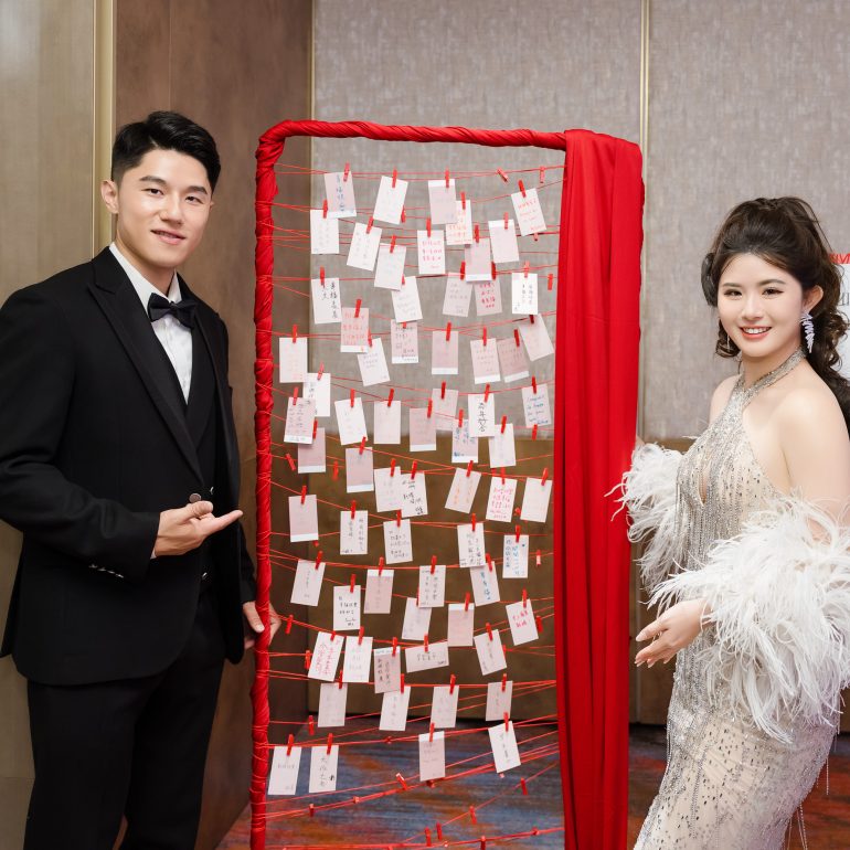 - 從迎賓時賓客繫上祝福開始,誓言被寫下,到暖戒儀式中沿著紅線傳遞,最後在成婚儀式中繫成一結,讓兩條原本分開的軌跡,正式走向彼此。